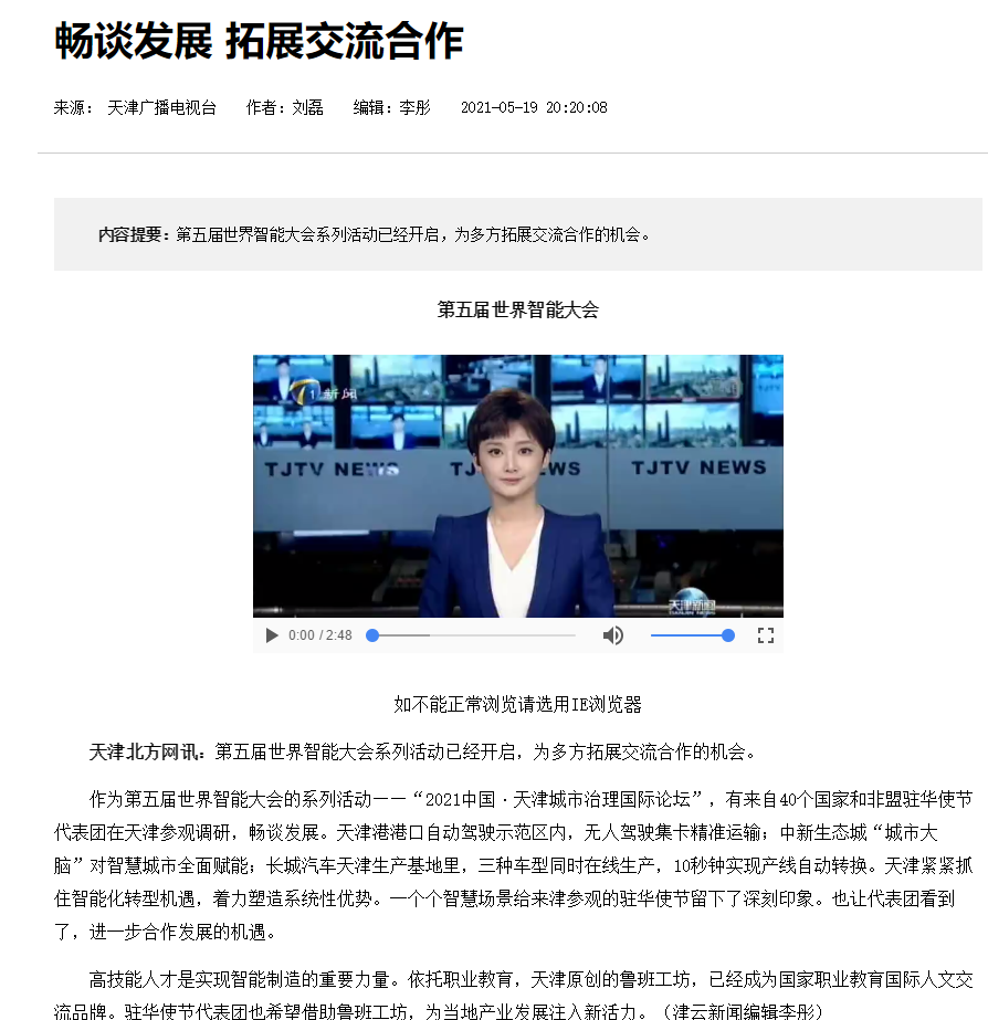 在第五届世界智能大会召开之际,来自26个国家和国际组织的驻华大使以及15个国家的驻华使节参访天津,并出席2021中国·天津城市治理国际论坛。